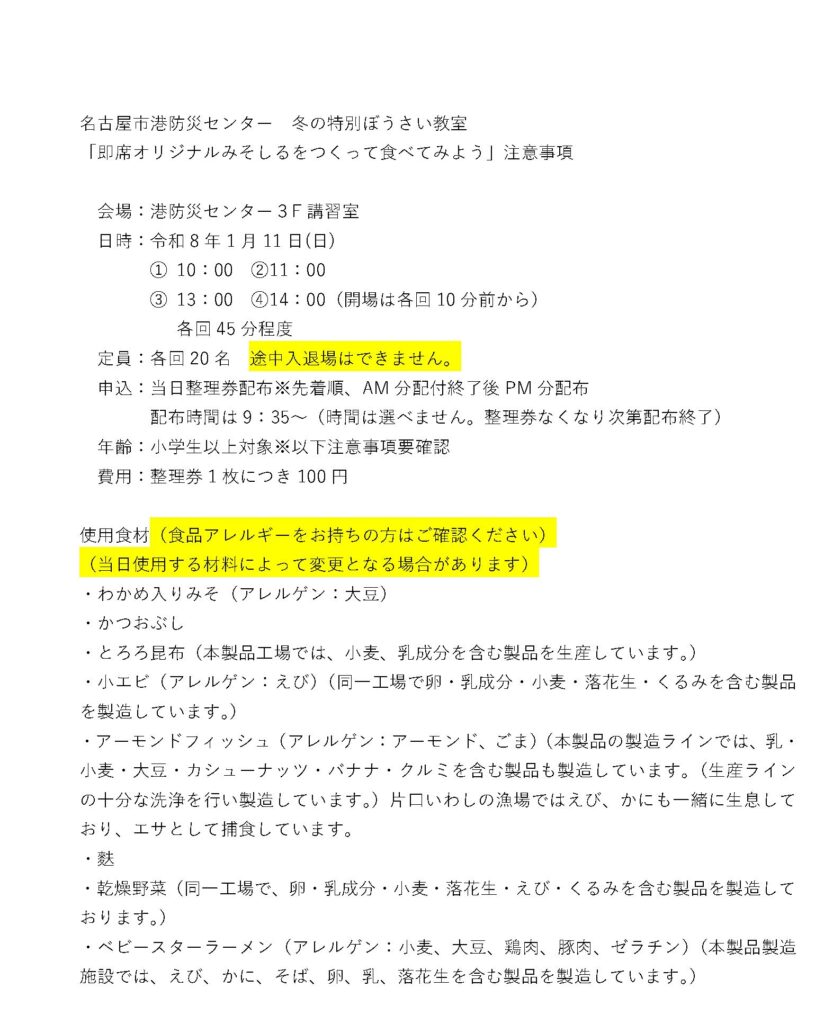 ・1月11日(日)「オリジナルみそ汁をつくって食べてみよう」、12日(月・祝)「お洗濯せっけんづくり」は、未就学児入室不可となります。ご了承ください。