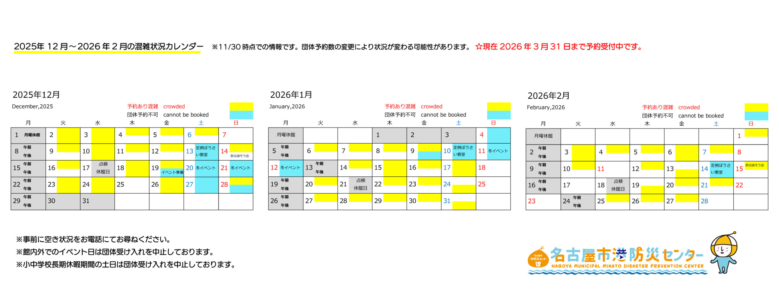 | 3班(10〜30名) | 煙避難体験 | 地震体験 | 伊勢湾台風体験 | |||||