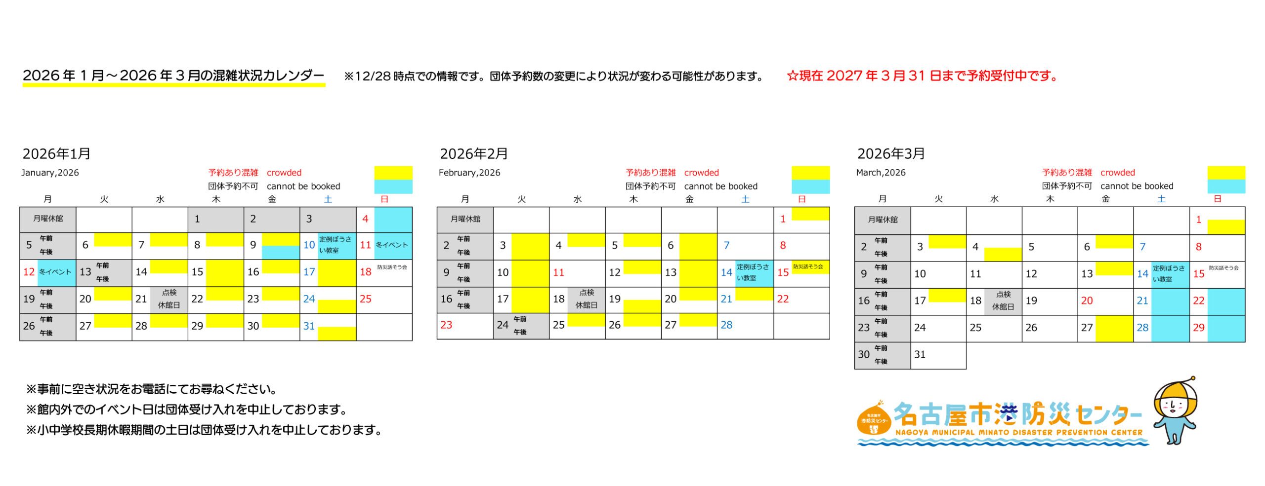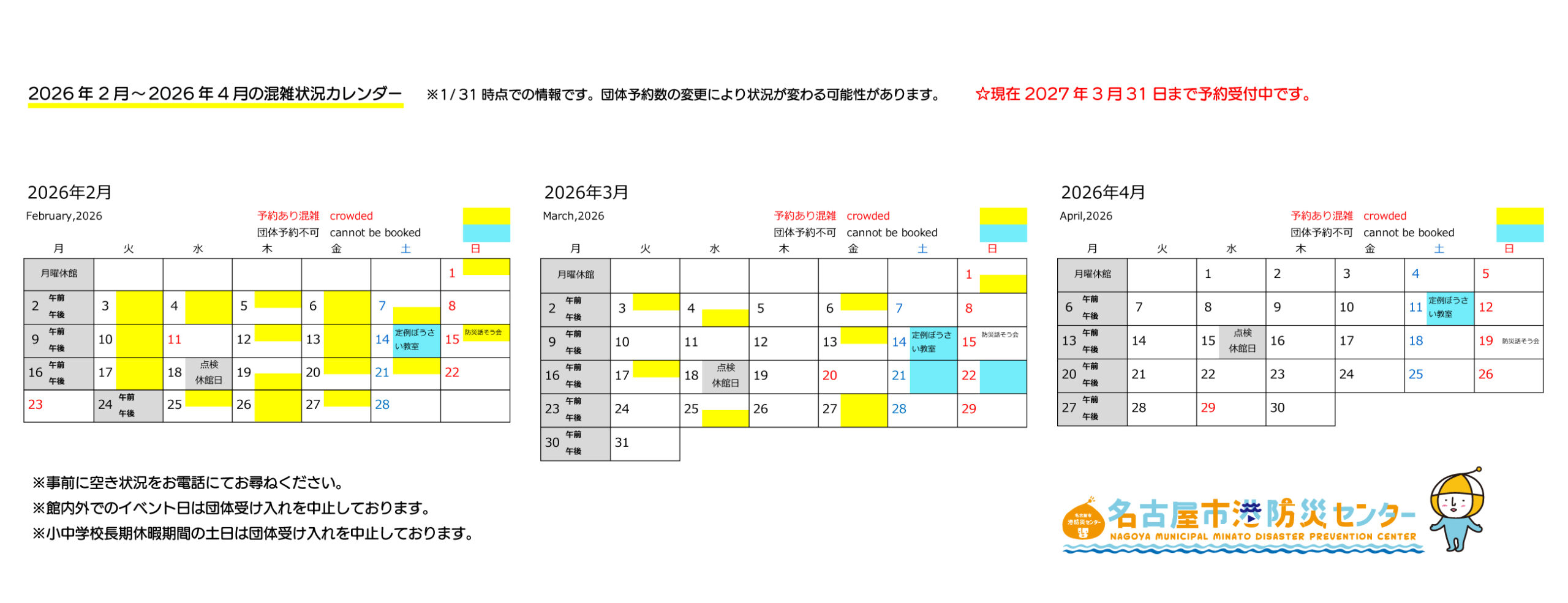 上限4班 | 1班(10〜30名) | 地震体験 | 伊勢湾台風体験 | 煙避難体験 | 自由時間 | 出発 | - |